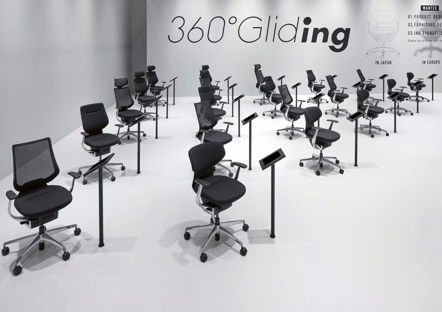 The display booth for the innovative “ing” gliding chair showcases the chair’s 360-degree smooth movement by means of various level areas that combine to create an overall statement. The first area presents a pure white chair that looks like it is floating on air. Dynamic pictures show the precise mechanism and smooth movement of the chair, stirring the imagination and making people want to sit on it. In the next colour reversal area, black chairs are arranged in neat rows in order to evoke a strong sense of expectancy, while the ICT tool visualising the glide gives visitors a more accurate, in-depth understanding.