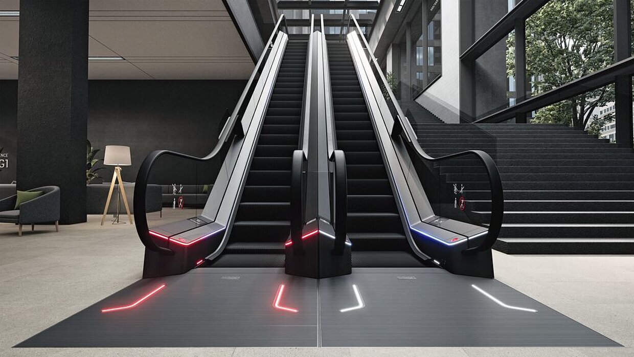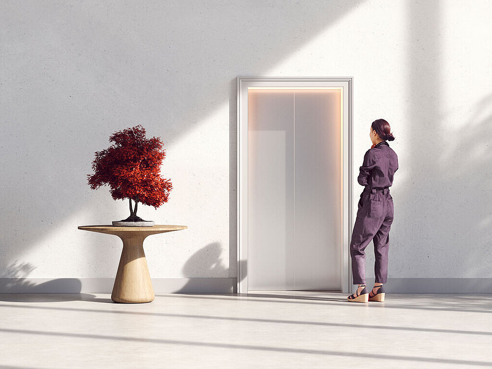 KONE Entrance is an illuminated elevator door frame that uses animated light to facilitate orientation in the waiting area in front of elevators. When an elevator is idle and available, a warm white light provides an inviting presence. In active mode, each user request is assigned an individual colour: the side frames of the corresponding elevator light up in the assigned colour, while animated light indicates the direction of travel. The modular system is easy to install and maintain in both new and historic buildings.