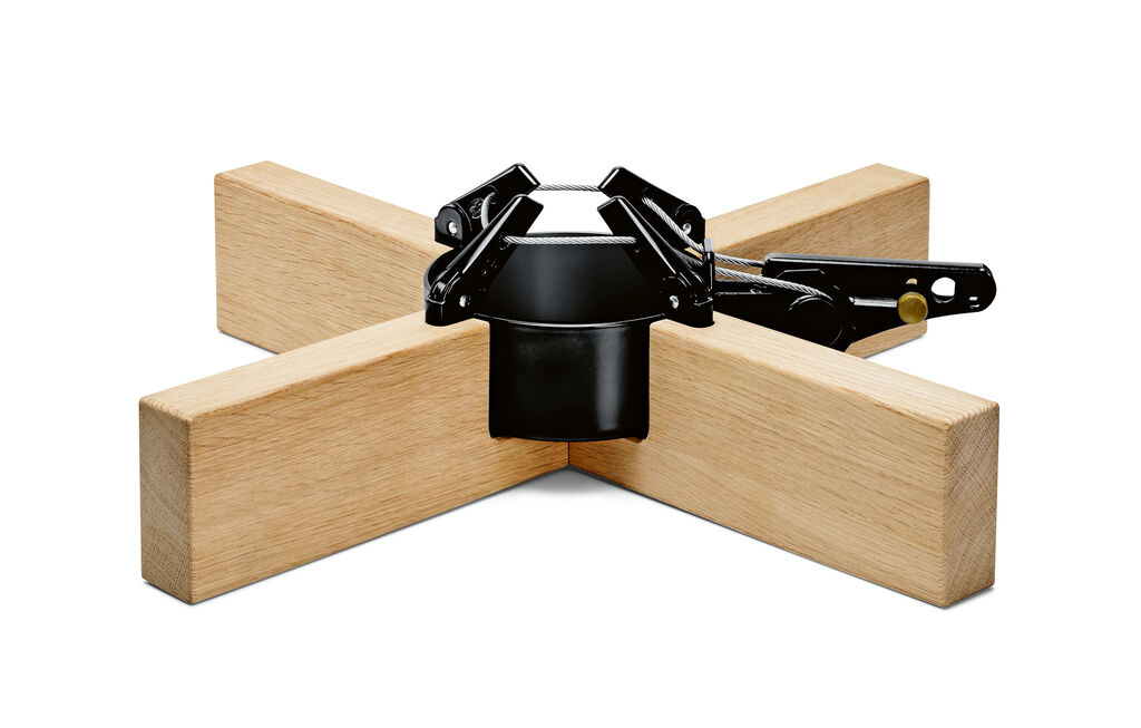 Inspired by Nordic design and Scandinavian purism, the design of the Kopenhagen Christmas tree stand deliberately chooses to refrain from using a traditional, contoured shape. With its clean lines, it looks more like an artistic design object and less like a utensil. This impression is reinforced by the combination of black or white steel with pale oak. The stand is equipped with single cable technology which firmly holds the Christmas tree.