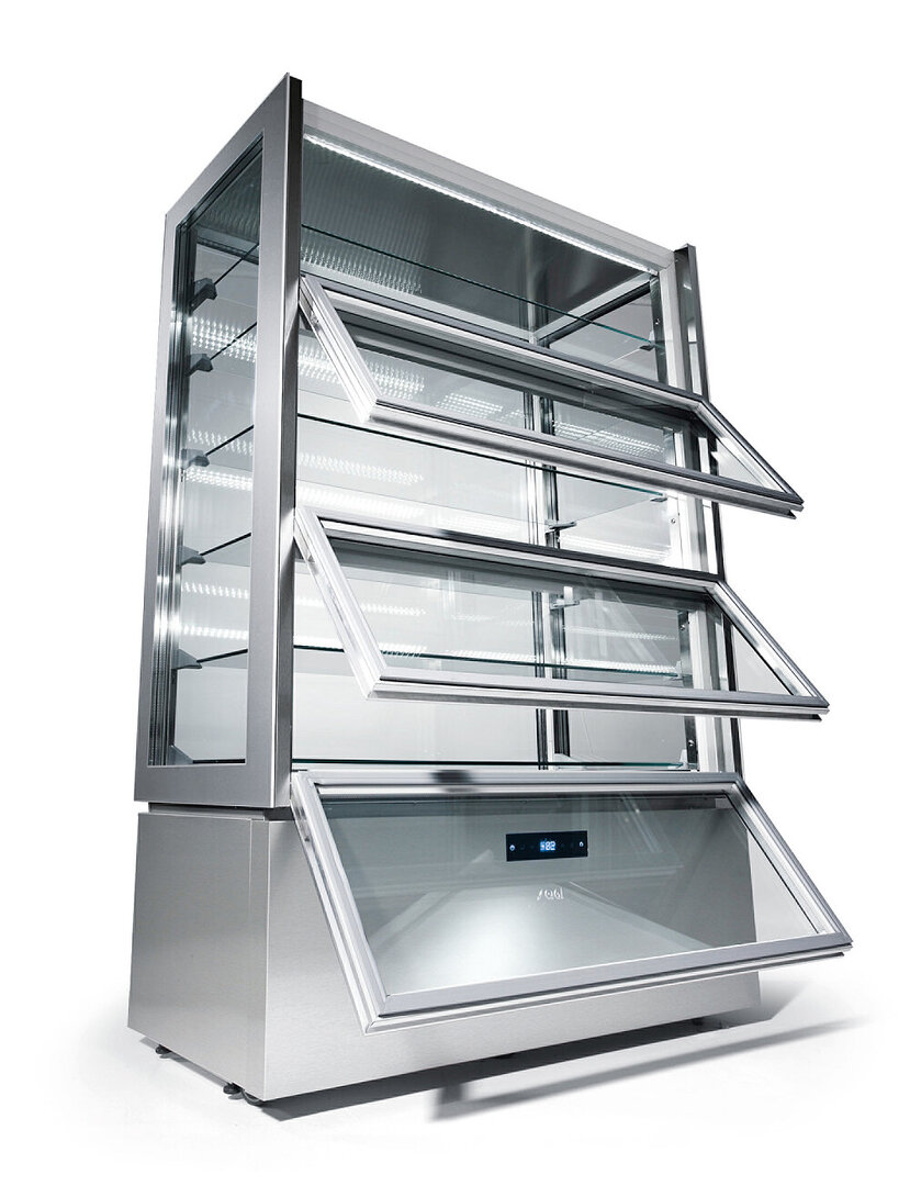 The Luxor Double refrigerated display unit succeeds in combining the elegance of its style with a high quality product presentation. Thus, the attention of the customers is drawn to the display unit and the products can be presented at a high aesthetic level. A lighting concept was combined with a lightweight, transparent superstructure and illuminates the display unit inside. The transparent attachment is made of tempered glass. The three display compartments are accessible via a pneumatic flap-door opening, which features a SoftMotion closing technology.