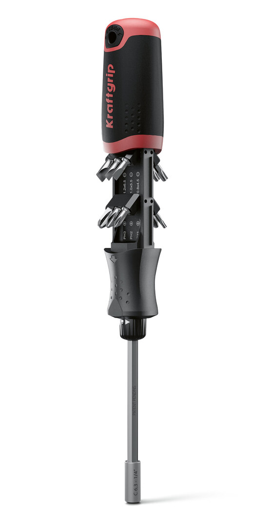 The ergonomic and high-quality Kraftgrip SilentGear screwdriver stands out with its patent-pending, low-noise ratchet mechanism and an easily accessible storage system for 12 standard bits integrated into the handle. It has a small backlash angle and allows precise work in confined spaces. The switch knob for easy switching between the right/left function of the ratchet mechanism also has a neutral position so the tool can be used as a simple screwdriver.