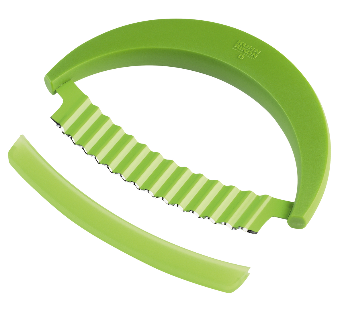 The Krinkle Knife makes crinkle cutting potatoes, cucumbers, carrots and other vegetables a breeze. The knife is equipped with a very sharp non-stick blade made of Japanese stainless steel. Designed according to ergonomic criteria, its round handle is suitable for both right and left-handed use. The complementary protective sheath allows for safe storage after use. The colours of the knife and the sheath are matched with each other harmoniously.
