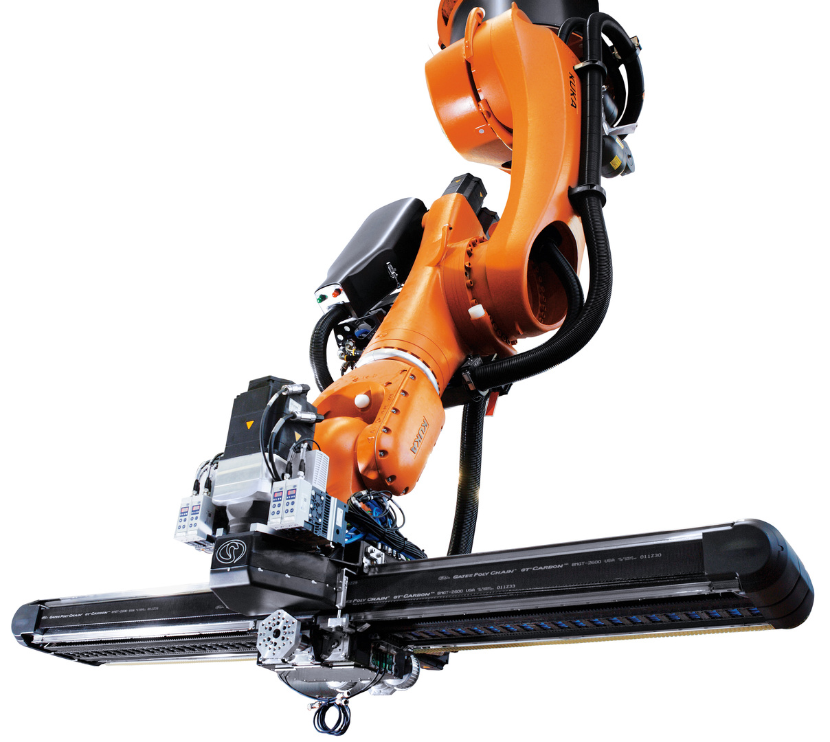 The Kuka Cobra is a very fast system for linking presses. An additional linear and pivot axis has been mounted to the robotic arm, which loads and unloads the presses. This increases output, reduces the distance between presses and combines the dynamic qualities of a linear axis with the flexibility of a robot. Moreover, the Kuka Cobra is made of carbon, which turns the system into a particularly advanced and lightweight construction.