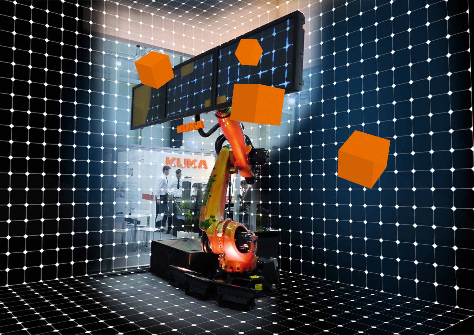 The trade fair installation from KUKA Systems GmbH was focused on a KUKA robot placed in an all-round translucent protection cube. The robot’s monumental appearance and ease of movement were used to create a mysterious choreography of captivating, dynamic appeal. Three large monitors were mounted onto the free-moving robot arm which, programmed to move to the rhythm of music, would make the monitors start to dance. Visitors were thus offered insight into a virtual space containing several themed units that were navigated and targeted by the robot one after another.