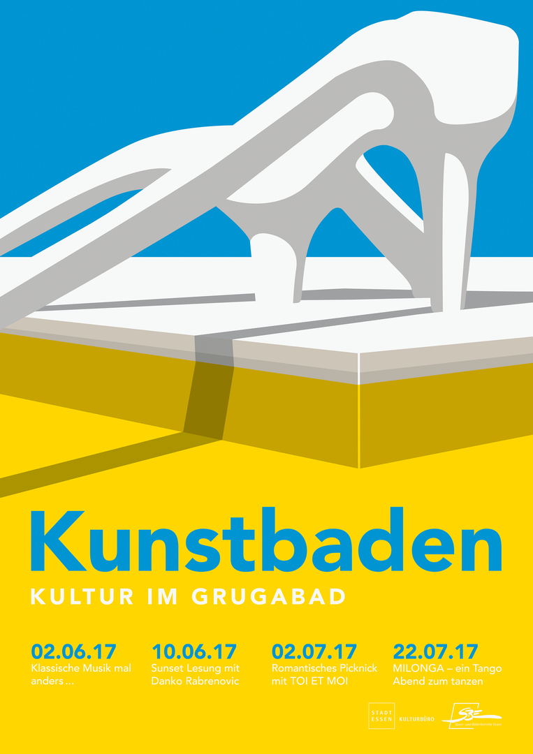 This poster communicates the cultural event “Kunstbaden” (art bathing), which took place at the Essen Grugabad for the first time in the summer season 2017. The city’s largest open-air swimming pool, with its distinctive early 1960s architecture, offered the stage on four occasions throughout the summer season for a series of concerts, literary events and dance performances. It was organised as a cooperation between Essen’s office of culture and the city’s sports and bathing companies. The design concept for the event also included a brochure.