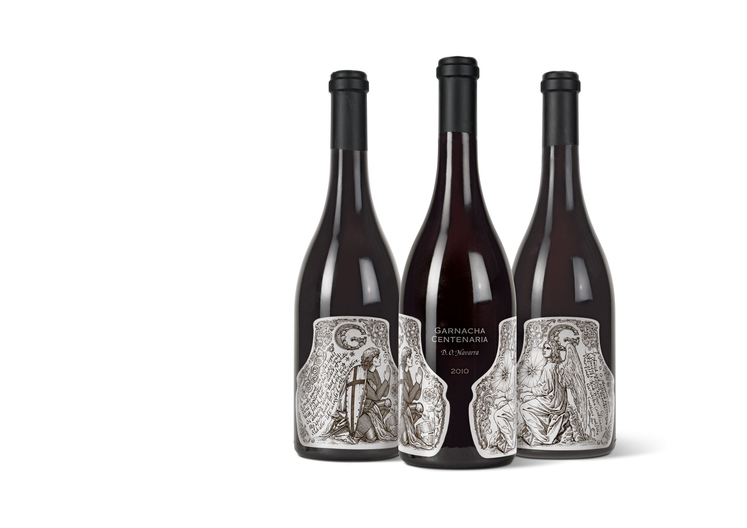 The packaging design of this wine brand is characterised by an unconventional label design: The contours of the paper labels with their detailed illustrations are die-cut to leave a gap in the form of a wine chalice between them. This is exactly where the lettering of the wine brand and the vintage is positioned. Also the illustrations of a kneeling knight and an angle direct the attention to the centre. Moving the front of the bottle from the label to the label gap stresses that the content is more important than the labelling.