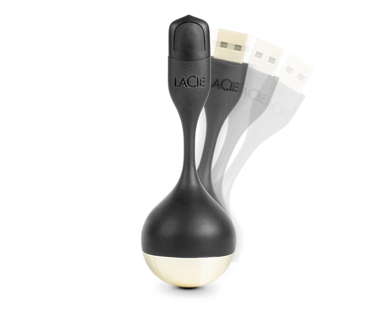 The USB flash drive called Culbuto takes the form of a golden half-sphere fashioned from metal and topped with a rubber USB plug. With its special weight distribution, the plug always swings back into an upright position. A clamp in the closing cap offers space for a photo or business card, turning the stick into a practical picture holder. It transfers files via USB 3.0 very quickly and has a memory capacity of up to 32 GB.