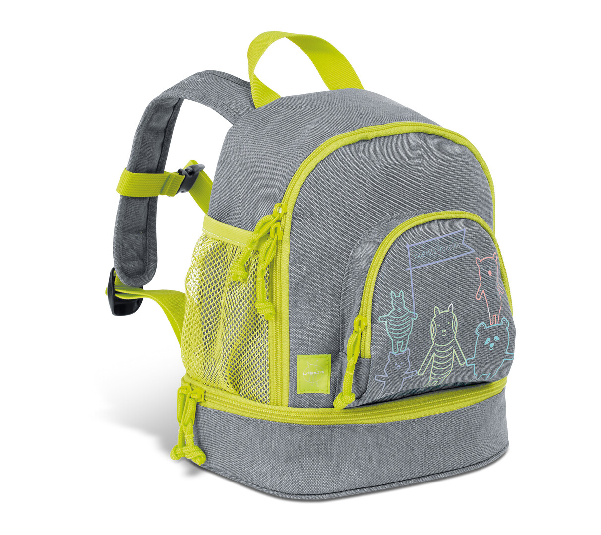 The Mini Backpack About Friends is conspicuous due to its highly contrasting design. The grey blend of the material is accentuated by elements in neon colour. One-third of the material is made from Repreve, a polyester produced from recycled PET bottles. The children’s backpack also carries a message: The five fantasy animals which are displayed on the outside and on the inner lining symbolise the five continents and represent friendship, open-mindedness and international cooperation.