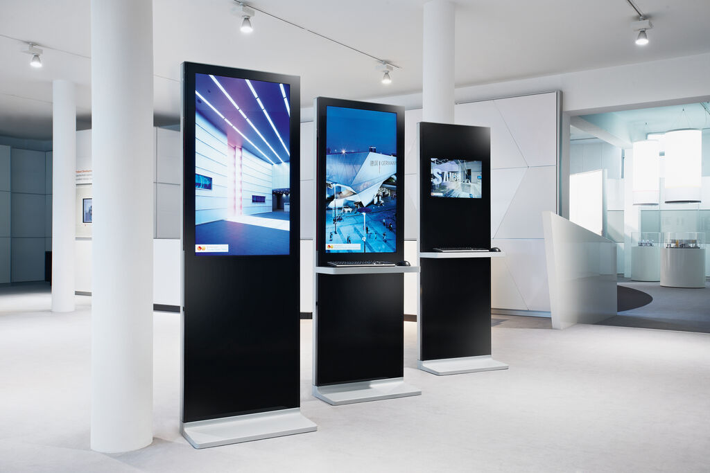 Lambda is a multimedia information stand for the attractive display of presentations and videos at trade fairs and events. It consists of screens in three different sizes and an integrated mini PC. In addition, either single-touch screens or a variant with a support for keyboard and mouse can be selected. An integrated loudspeaker allows for the broadcasting of acoustic signals.