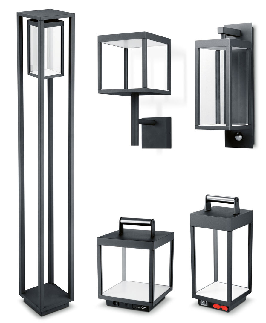 This outdoor lighting series takes up the look of traditional lanterns. The distinctive combination of an aluminium body with glass surfaces underlines the pleasant light temperature of the LEDs. The wall lamps are equipped with an integrated motion detector, with a detection range of six to ten metres and a detection angle of 120 degrees. The lighting time can be set between eight seconds and eight minutes. The series includes two wall lamps, two portable lamps and a matching bollard lamp.