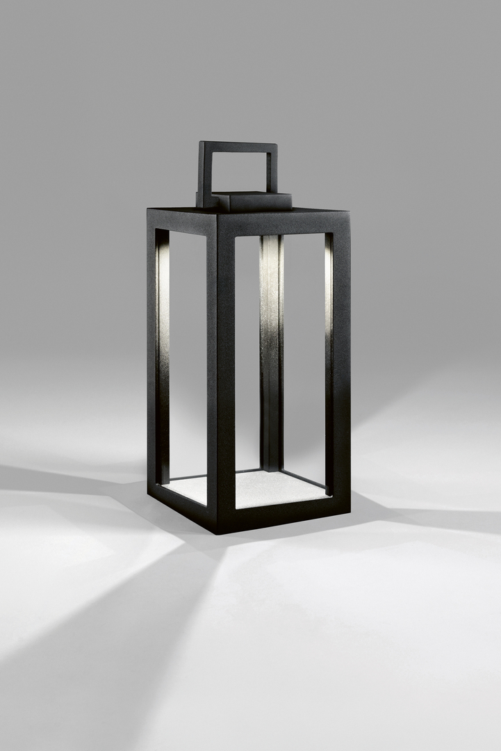 The design of the LANTERN Collection is based on the contemporary interpretation of a classic lantern. Rectangular glass panels framed by black lacquered aluminium combine to form a cuboid. The indirect LED source creates an interplay of geometric areas of light and shades, lending the collection an architectural appeal. The series includes wall, bollard and portable lights, all of which are available in different sizes.