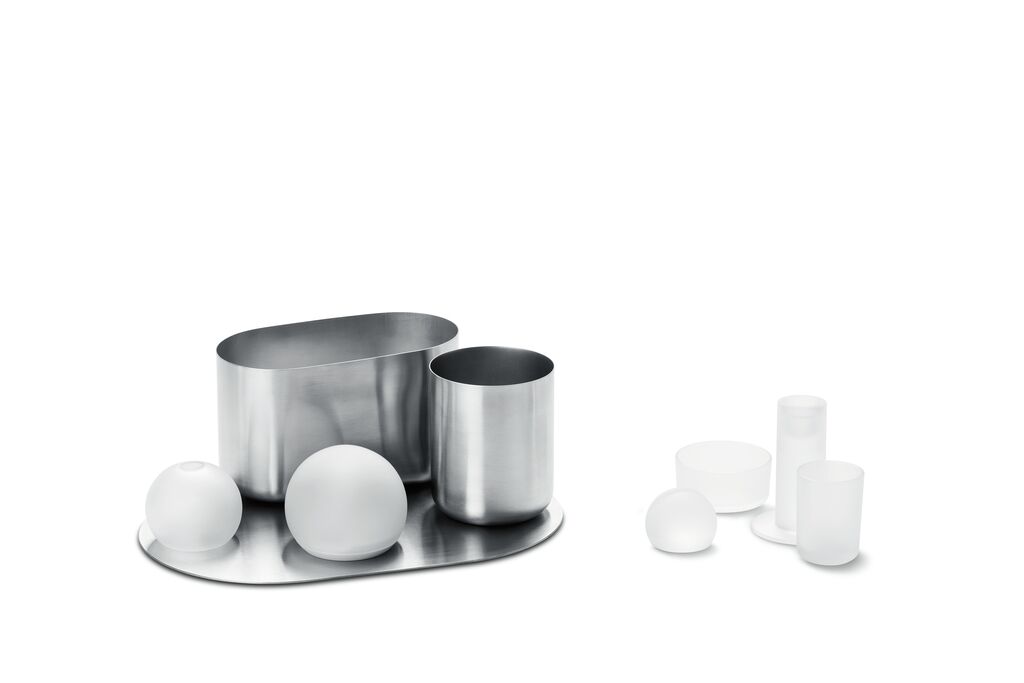 Inspired by nature around the polar circle, this range of containers can be used in different ways within the catering industry. These elegant pieces can be flexibly combined and were developed to simplify table settings. Thus, the stainless-steel container has a removable inner compartment that can be used either as a cutlery or menu holder or as an ice bucket or vase. The glass containers offer space for candles, snacks or cocktail sticks.