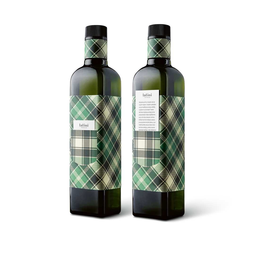 In a clever manner, the packaging design for Latini olive oil combines branding with quotations from the fashion world. The label adopts the look of a beautiful chequered shirt whose green hues match those of the olive oil inside the bottle. This textile appearance is continued by the product information hidden in a small pocket. The smart concept thus enhances the product and makes the bottle look highly decorative on the table.