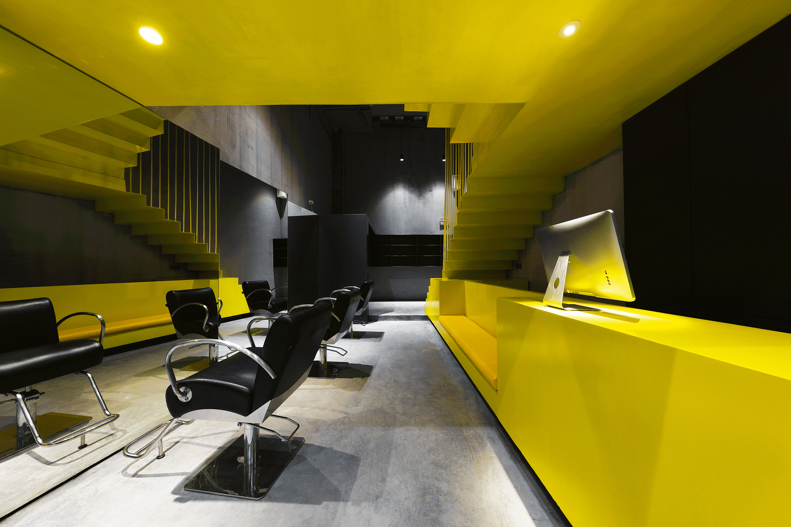 This design for a hairdresser brand places a bright yellow sculptural staircase centre stage. Constructed as a transparent “installation”, it bridges a large vertical distance by adding an extra platform to expand functionality. Used to fulfil versatility, the design features steel bars that serve as a railing, allow air movement and avoid visual obstruction. Standing out against the walls, floors, ceilings and functional furnishings in black and dark grey, the staircase creates a sharp-coloured visual focus with an intense urban feel.
