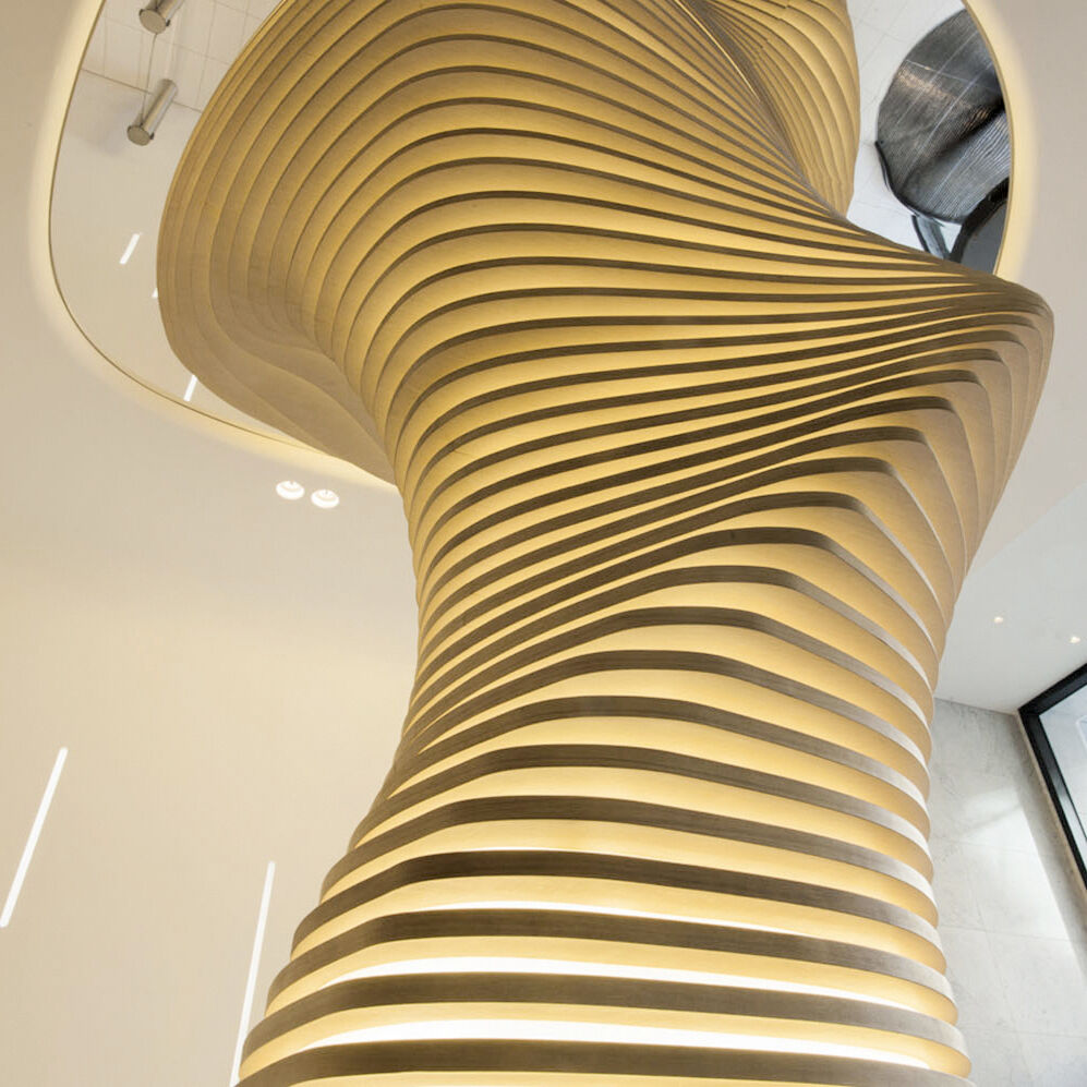 Le Madeleine is an emblematic building in the central business district of Paris. The reception area of the entrance lobby is characterised by an organic use of form and the use of Corian and wood. The staircase is enveloped by a massive shell of white Carrara marble. A central, iconic “luminous tree”, made of wood, rises like a futuristic totem pole whose normally nature-dominated shape symbolises “controlled” growth.