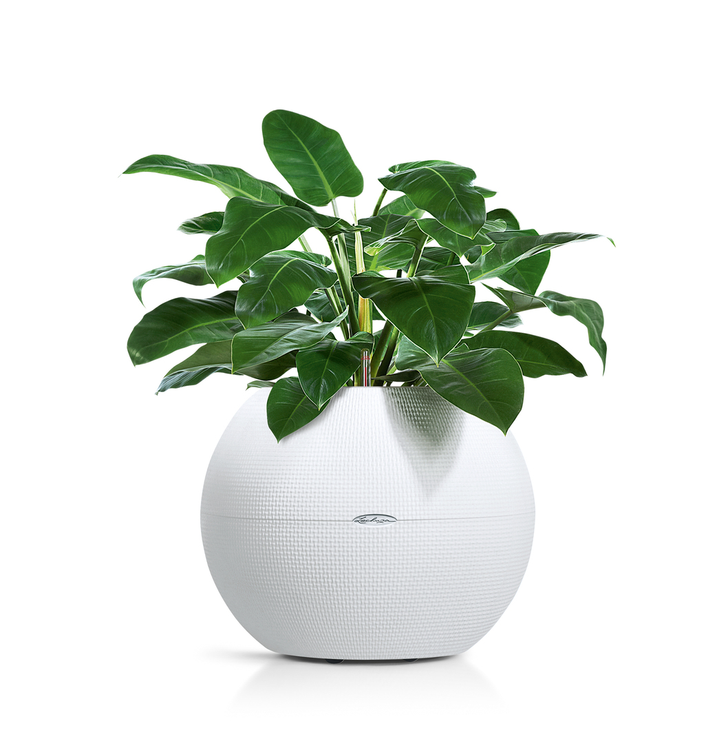 The Lechuza-Puro planter presents itself in a classic spherical shape in its contour as well as its surface structure. Made of weatherproof polypropylene, the container looks as if covered with fabric. Thanks to a non-visible coaster it appears to float above the ground. Its plant liner with sturdy carrying handles enables an easy exchange of plants. The integrated water reservoir supplies the plant with water.