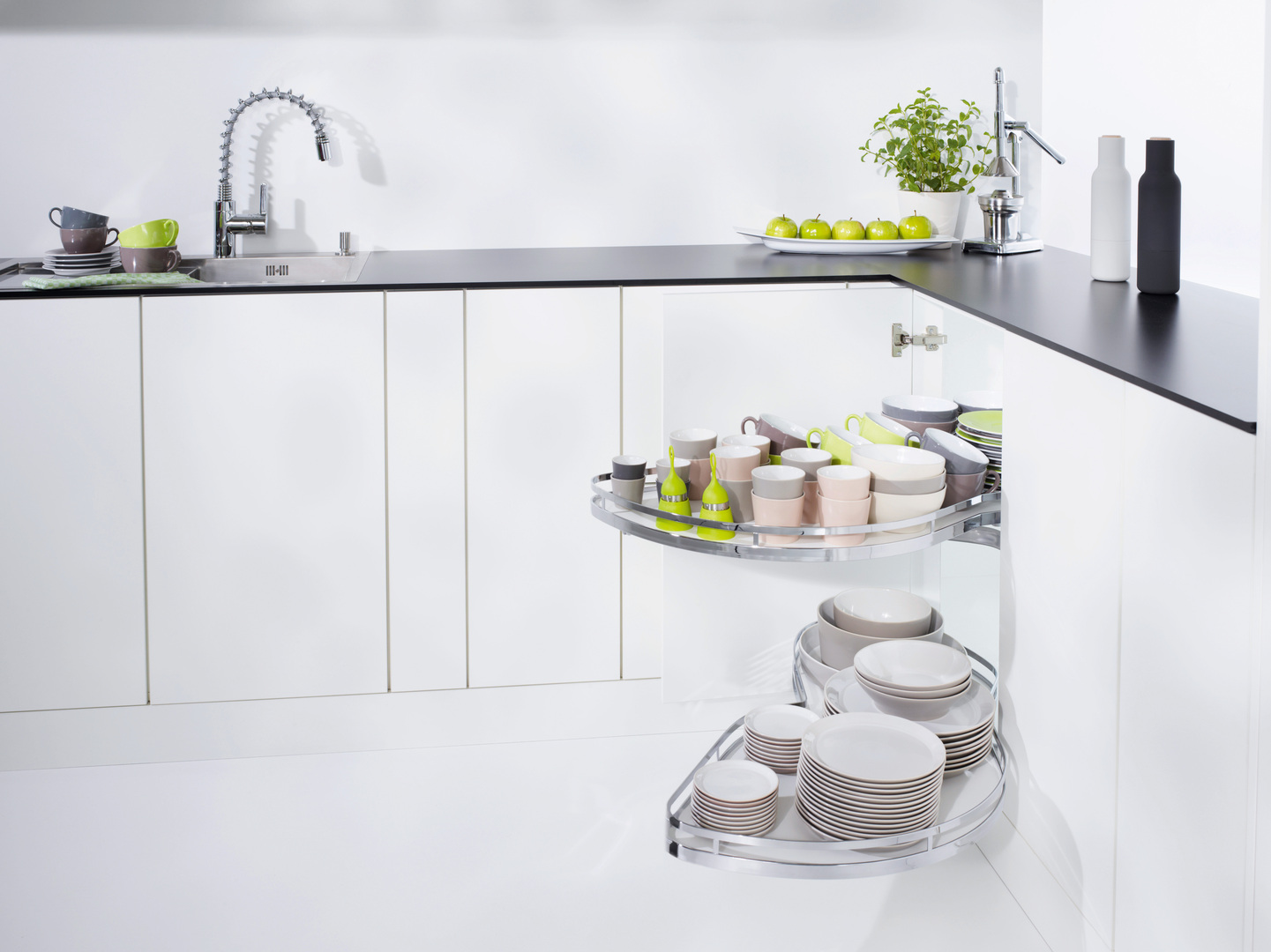 The LeMans II swivel fitting for corner cabinets allows direct access to everything that is stored: each of the elegant trays with their chrome-plated railings can be completely pulled out of the corner cabinet separately. They are height-adjustable without tools and can thus be adapted flexibly to individual needs. The cushioned self-closing mechanism can be attached to the right place without the use of tools. It ensures smooth and silent closing and offers special ease of use.