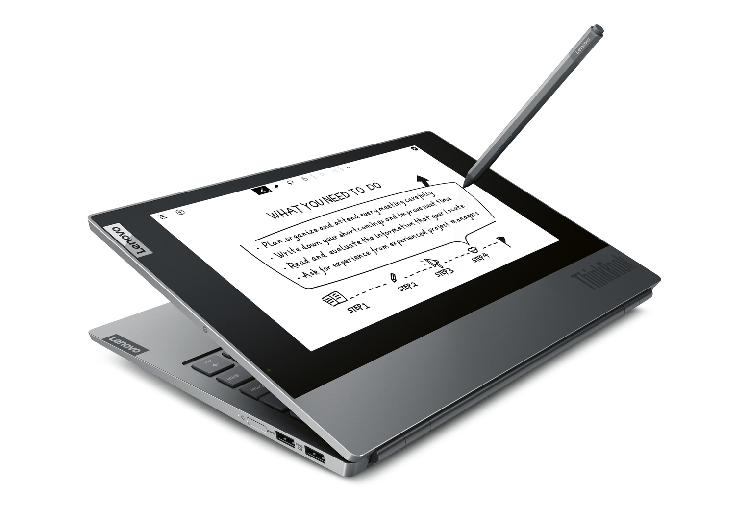 ThinkBook Plus is equipped with a 13.3" IPS LCD display as well as a 10.8" E-Ink display that is integrated into the cover. The second screen is for taking notes, drawing or showing incoming messages. Notes are directly digitised and stored on the SSD. In addition, the user can log in to Windows via the display without opening the laptop. On the hardware side, tenth-generation Intel processors, up to 512 GB of hard disk space and 16 GB of memory are supported.