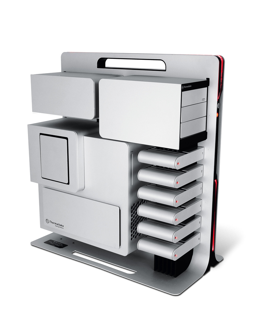 The Level 10 Limited computer chassis has a modern and innovative appearance. Compactness and performance are reinterpreted by means of its open design. A modular structure highlights the built-in hardware components, such as the drives, which are stored in individual casing. This is complemented by the sandblasted aluminium surface accented in red, thus lending the chassis a high-grade appeal.