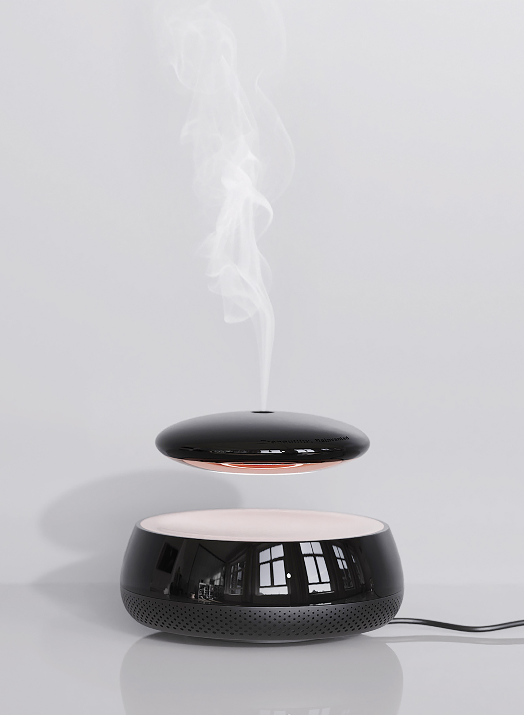 The Levitation+ all-in-one device combines aroma, light, and sound therapy in a sleek and modern form. The diffuser emits a soft, fragrant mist, with light reflecting gently from a metallic plate and calming sound playing from its Bluetooth speaker. This is complemented by a levitating module that floats above the base, evoking stillness and balance for harmonious sensory immersion.