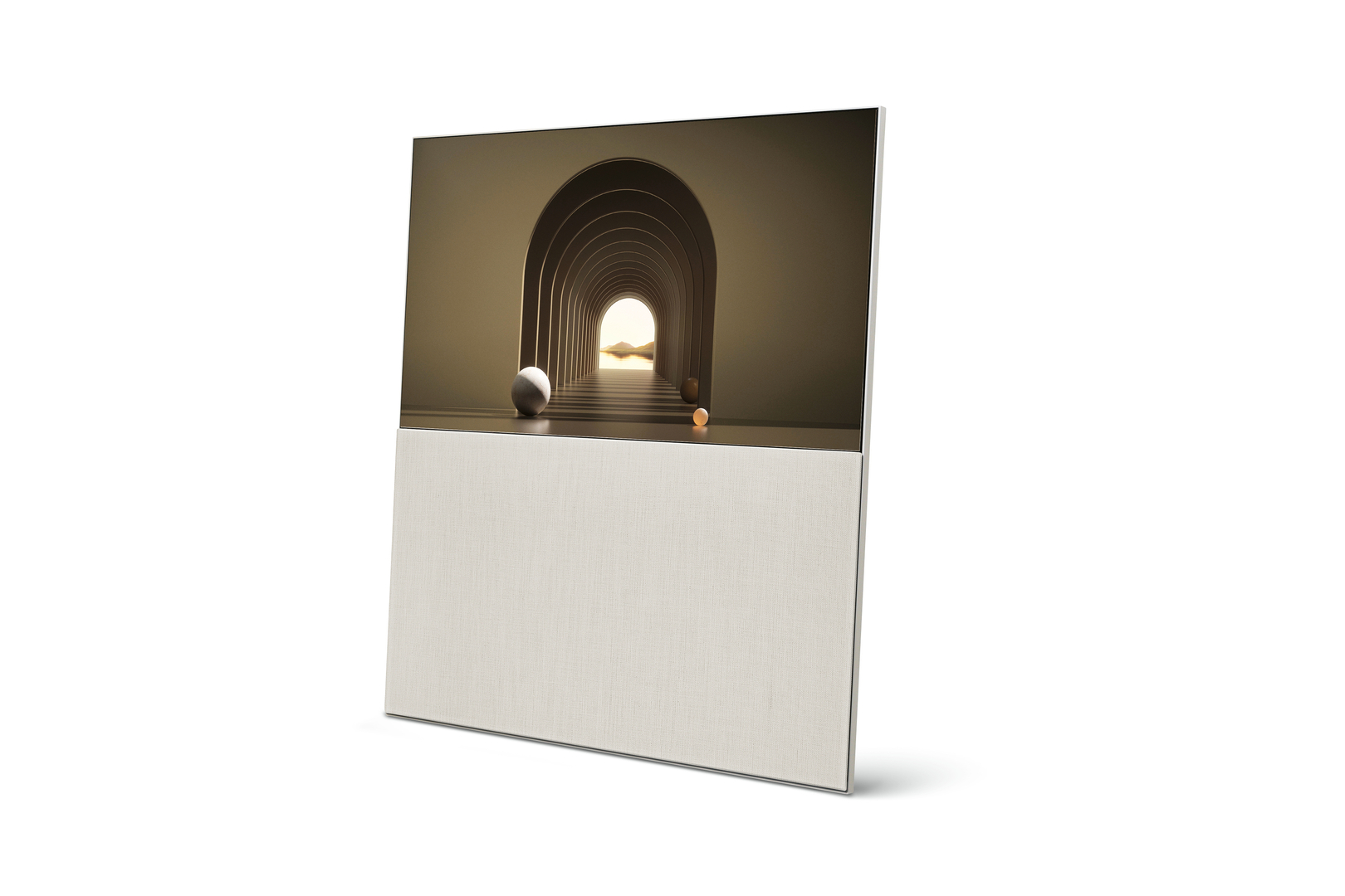 The TVs of the LG OLED Objet Collection 65ART90 can be hidden in full or in part behind a fabric cover. In this state, they are reminiscent of a canvas and take on the character of a work of art.
