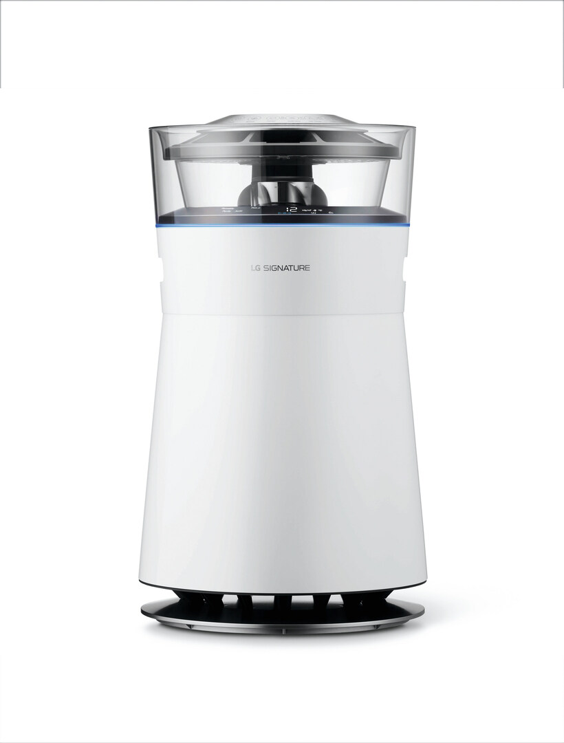 The functionality of this air purifier is inspired by the natural phenomenon of rain washing pollutant particles from the air: the LG Signature Hybrid Air Purifier sucks in polluted air through the filter, washes it with clean water and emits fresh, clean air again. This process can be observed through a transparent section of the enclosure. The easily accessible water tank can be pulled out of the top for filling and cleaning.