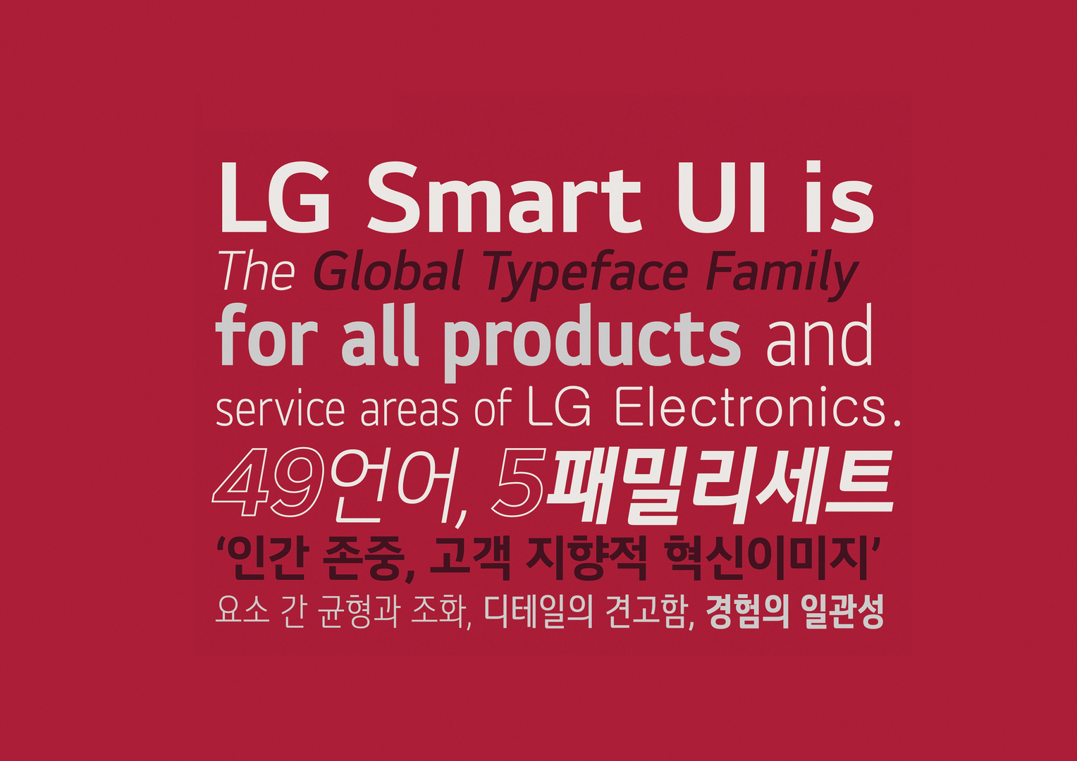 The LG Smart UI typeface is applied to user interfaces and the physical surfaces of electronic products, providing a consistent visual identity by integrating the fonts used in all customer product and service contacts in the course of the company’s marketing activities. The corporate typeface expresses LG Electronics’ philosophy of “Respect for human dignity” and “Customer-oriented innovation” in its smooth curves and open forms. This is a flexible font family optimised for the characteristics of both display and print, as well as being implemented in products. It supports 49 languages and ensures a unified brand experience.