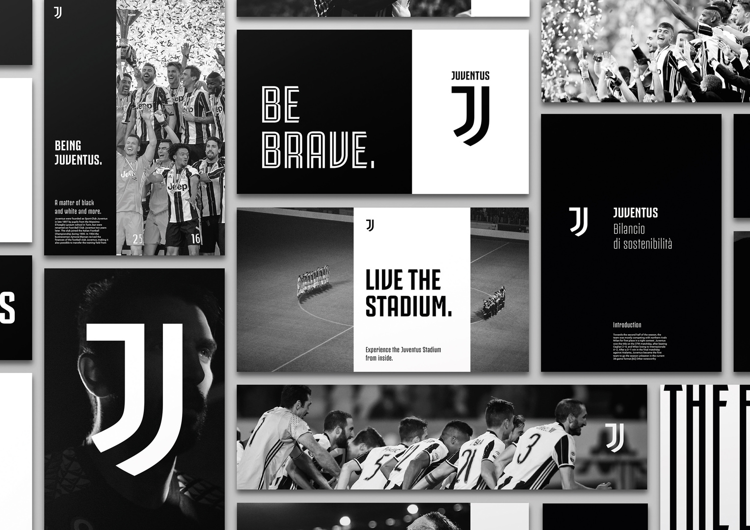 The mark captures the fearless DNA of the Italian football club Juventus in a shorthand icon that holds the visual heritage of the club while pushing towards modernity and its potential to embrace wider entertainment cate-gories. It represents the very essence of Juventus: the stripes of the football jersey, the scudetto shield and the iconic J initial. The bespoke display typeface (Juventus Fans), a strong grid system and a bold photographic style are the foundations of the signature visual system.