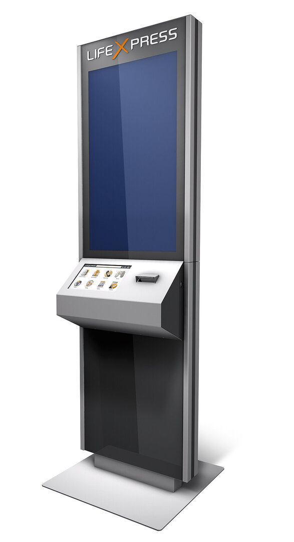 The LifeXpress content kiosk is a customer terminal where vouchers or digital products such as games, software, e-books and prepaid cards can be purchased. The customer chooses the desired product via the interactive touchscreen and a corresponding receipt is printed out, which is then taken to the checkout. After payment has been concluded, the customer receives an active code to be redeemed online.