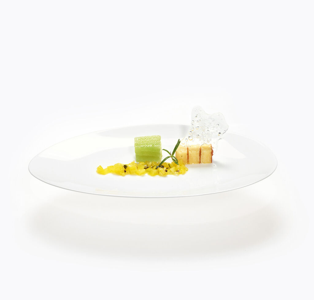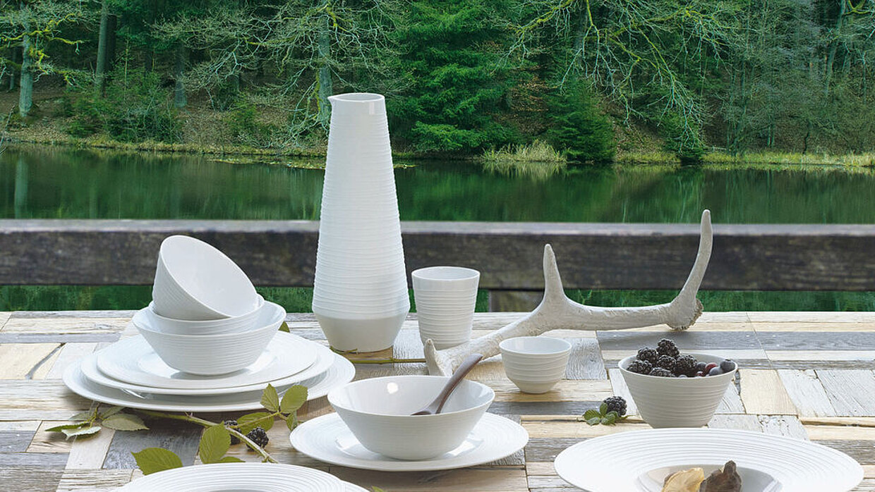 All items of the Light tableware are of snow-white porcelain. The porcelain is so thin that it appears almost transparent and is particularly light. The lines are organic, whereby the elegant forms are slightly asymmetric. The collection consists of four round and two oval pieces, salt and pepper set as well as beaker and water carafe.