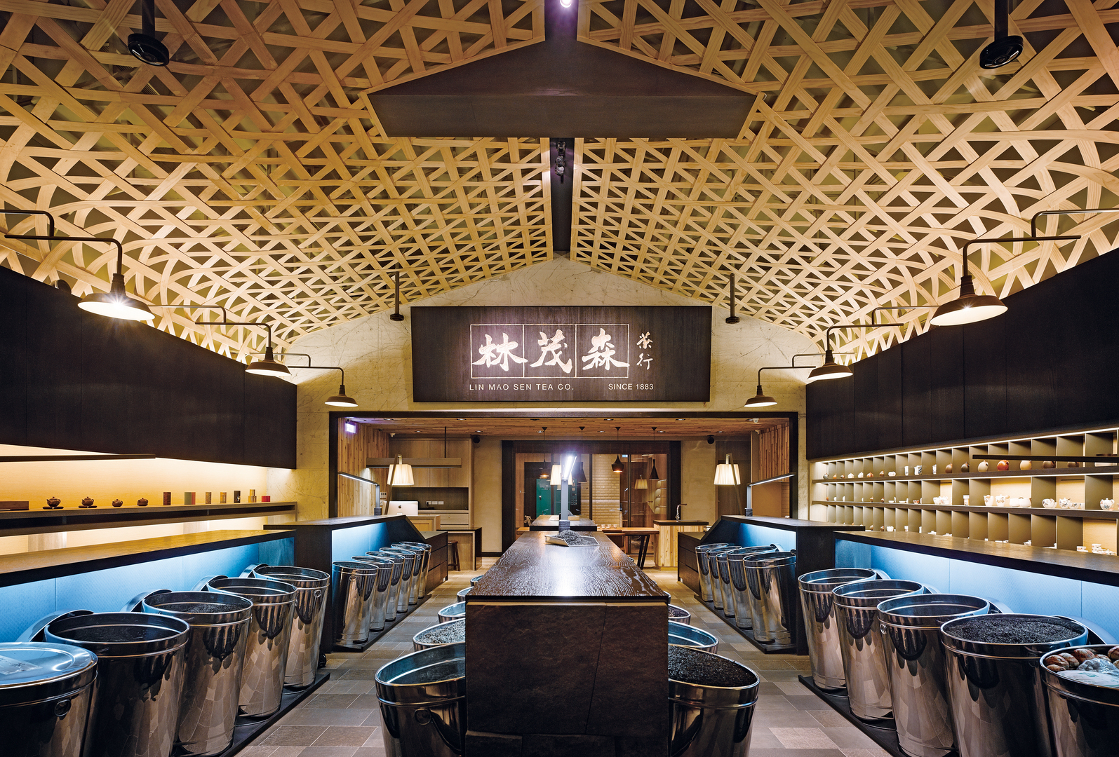 An atmosphere of tranquillity and contemplation has been created in this tea store through a clear symmetry, an artistic design of the ceiling, warm lighting and the generous use of wood.