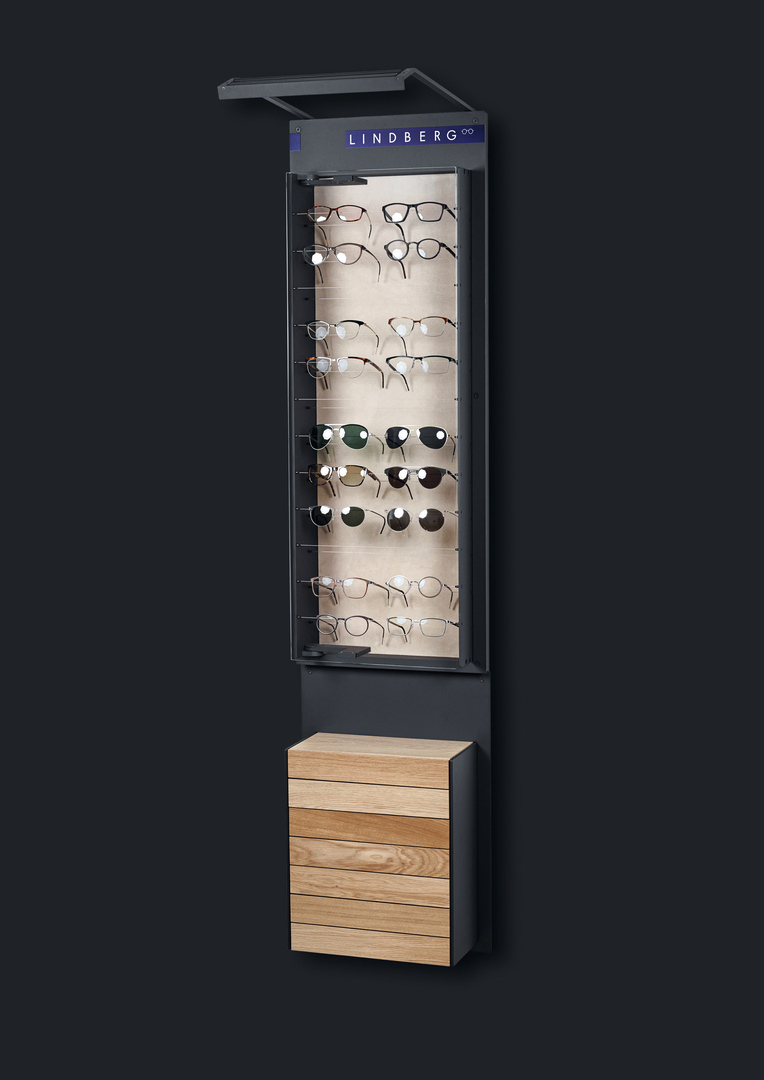 This wall display for optical stores, as well as the glasses made by this manufacturer, exudes an air of Danish minimalism. The display is characterised by its powder-coated aluminium and steel wire case, which offers space for 24 pairs of glasses. Their light goat-skin back walls provide a good backdrop for the glasses. Handmade, solid oak drawers can hold up to 36 frames. A noteworthy feature is the LED light whose prisms can be adjusted to break the light in different ways and thus contribute to an impression of uniformity.