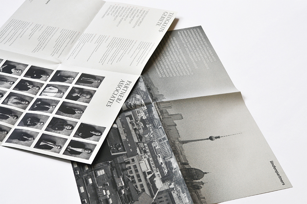 lindenpartners, a business law firm based in Berlin, presents itself as a creative community, which does not shy away from conflicts with big companies, but rather confronts them boldly. This spirit is expressed by their visual identity. At its heart is a visual language of portrait and documentary photography and film, which provides a personal and authentic depiction of the lawyers and their work. The corporate design targets with black-and-white photography, vivid colours, customised typography and high regard for materials, among others, the Berlin start-up scene.