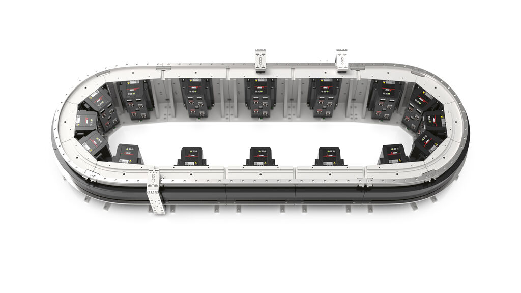 This automated conveyor system uses electromagnetic drive to move goods at high speed along modular tracks. In addition to flexible control of speed and direction, it can also be linked to a 3D simulator in order to uncover optimisation potential. The electromagnetic components of the conveyor system are painted black, while the guide rails are made of uncoated metal. The result is a sophisticated appearance that remains intact even with long-term use.