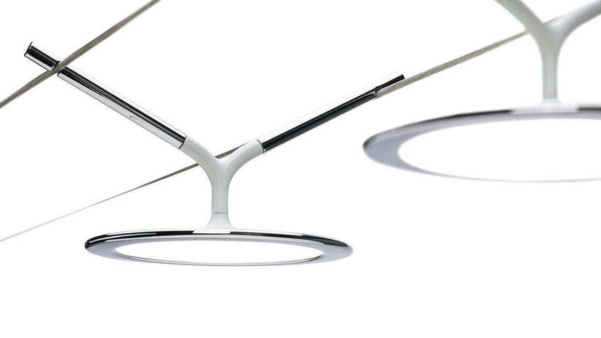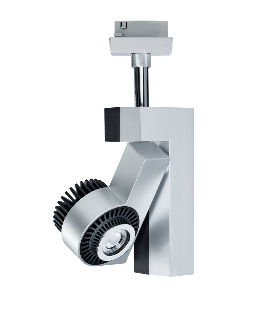 This LED spotlight for a two-phase rail system delivers a light output of 840 lumens and is equipped with two interchangeable lenses for different reflected beam angles. The L-shaped support element integrates a rotary support, the electronics as well as a shaft, which leads to the pivoting LED arm. The arm provides a visually appealing contrast to the tangentially placed light cylinder. The interchangeable lens head with its functional ring heat-sink complement the product concept.