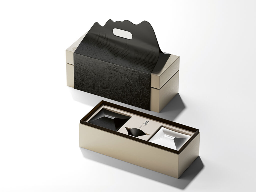 The Linshufu Traditional Dark Tea Gift Box is a tea set with elegant packaging that relates the history and culture of the items it contains. Its theme, “Returning to the Forest”, refers to the original source of black tea and its connection to nature. Depicting the silhouette of a mountain range, the outer sleeve features blind embossing with a historical motif of tea cultivation. The inlay of the high-quality wooden box has been crafted to provide a precise fit for the tea canisters and teacup.