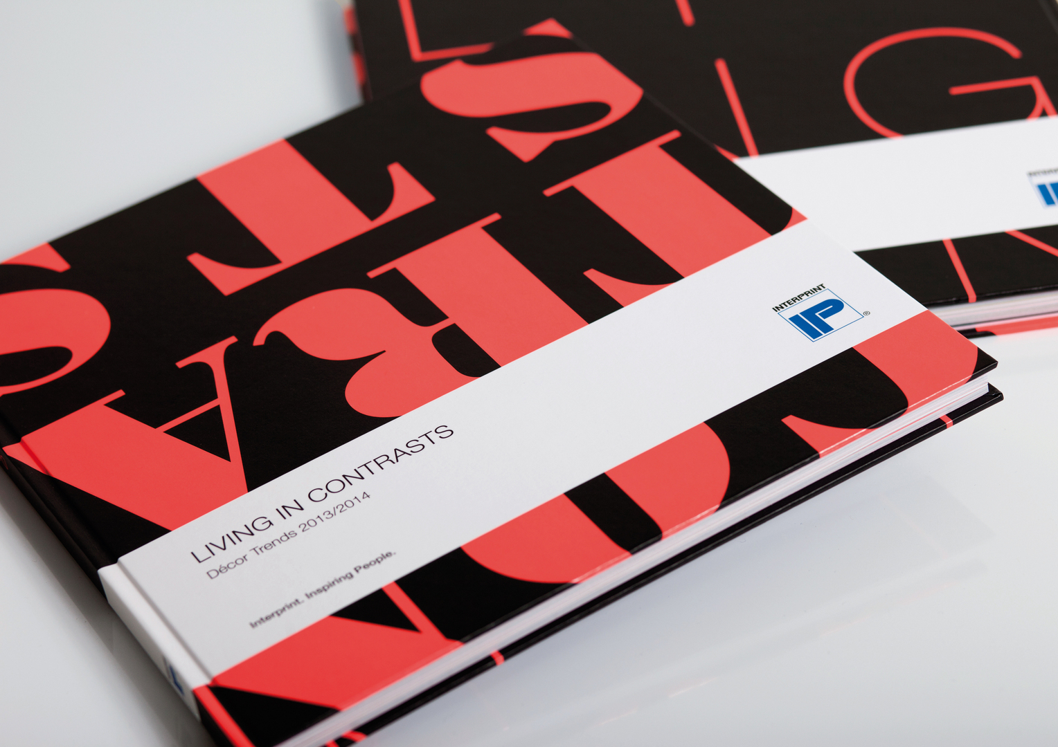 Aiming to present the latest décor pattern trends to an international audience, the design of this book focuses on staging contrasts and thus manages to surprise its readers. The creative slogan of the commissioning company Interprint – “Living in Contrasts” – is presented visually, haptically and verbally as a world full of opposites. Décor patterns are displayed side by side with informative texts, while the overall contrast-rich design approach lends an emotional appeal to the patterns, colours and textures of wood, concrete, stone and other building materials.