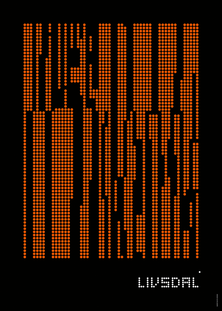 This poster series visualises the graphic identity of the Swedish company Livsdal. Symbolising the company’s competence in the field of air purification, the logotype consists of small dots evoking a refined and clear appearance. The posters display Livsdal’s “alphabet of dots”, which is recognisable across all of its communication materials. Every poster showcases a distinctively spirited signage of dots. These energetic and clear-cut dots create vivid images, further enhanced by the sharp, contrasting colours of orange, black and white.