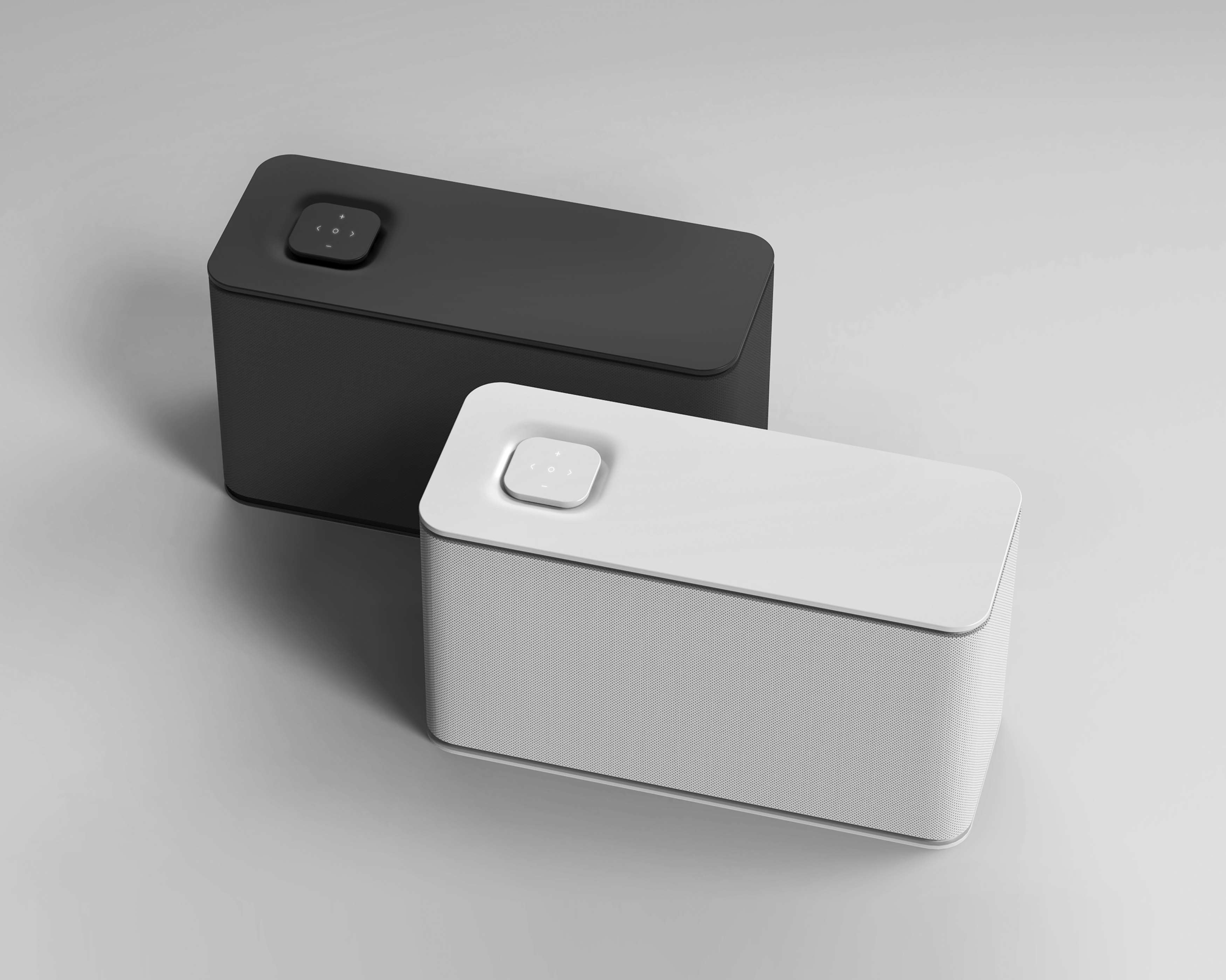 This basic geometrical shape becomes unique with the fabric between two plastic surfaces creating floating effect and a soft dent on top where the remote sits perfectly and integrates with the main unit. This sophisticated speaker comes with the black and white options as a complementary to its minimal approach.