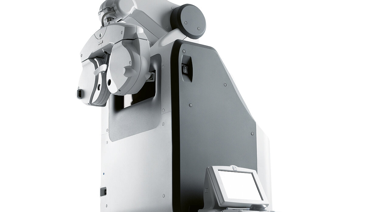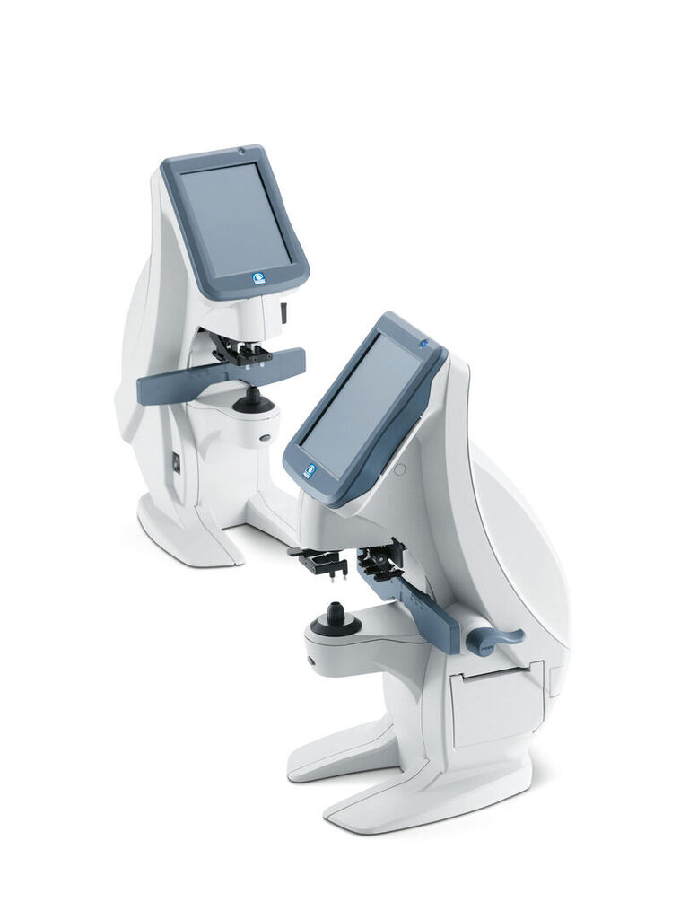 The auto lensmeter LM-7P identifies the lens strength of corrective spectacles. With its rounded form, dynamic lines and light colours, it conveys a sense of calm and safety. The central design element is the display, which is characterised by its vertical orientation and optimised angle of inclination. The double foot of the measuring device, reminiscent of a classic laboratory microscope, provides high stability.