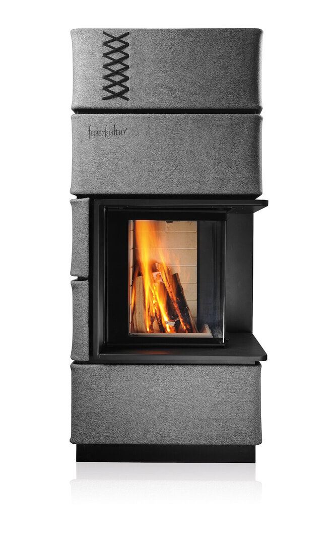 The original Lodenofen is a wood fireplace with a unique textile surface. Loden fabric has been made in the Austrian Alps from sheep’s wool for over a hundred years. Its soft, smooth form lends the Lodenofen a pleasing timelessness and permanence. The horizontal structure in combination with the fine Loden and matt-black metal surfaces gives it the appearance of a design element in any room. The wood fire behind the panoramic door to the combustion chamber exudes cosy warmth.