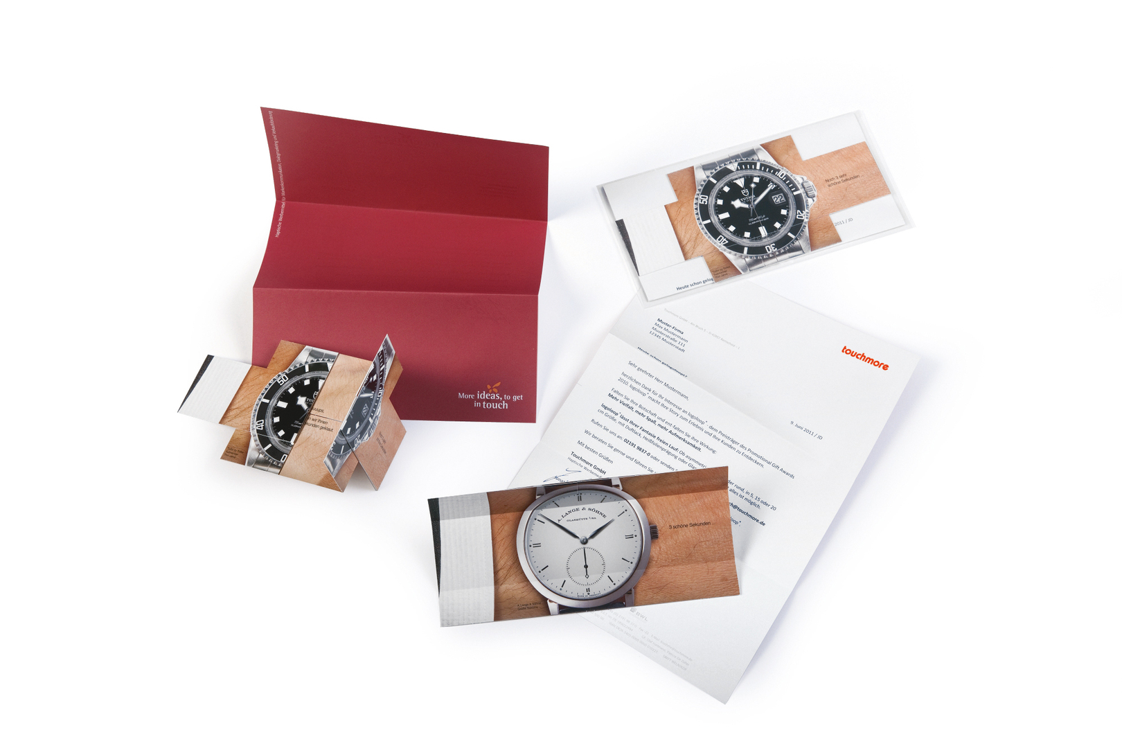 The exemplary design of the logoloop product brochure uses the well-known technique of the endless-fold-card to unfold the advertising message before the eyes of the beholder in four steps, and in unending succession. Cutting through the cardboard with a precision of 1.4 μ, the patented production process allows the use of cellophane as a hinge. The result is that a logo-loop unfolds without resistance from position to position.
