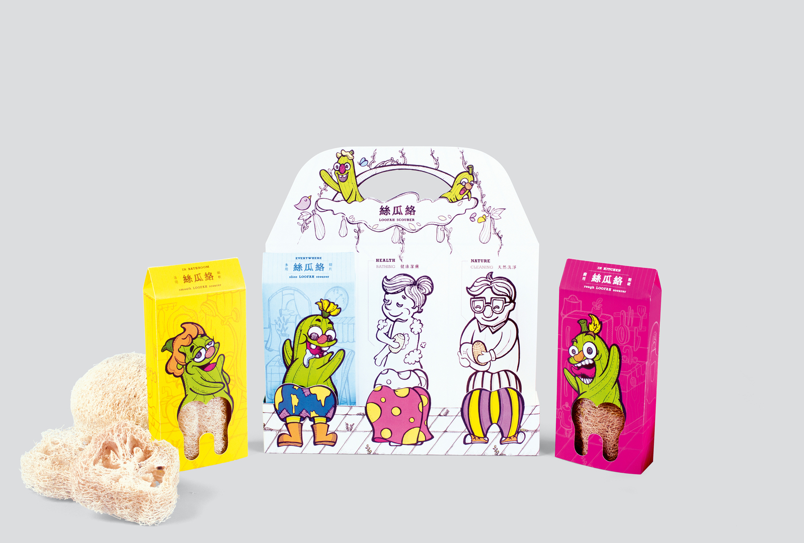 This packaging accommodates cleaning sponges made of loofah and is designed as a house. It comprises three boxes showcasing a humanised caricature of a sponge pumpkin in the foreground. A recess in the area of the pumpkin’s bottom offers an unimpeded view of the real sponge and its texture. In addition, the boxes, which come in pink, yellow and blue, are decorated with illustrations of various rooms. Consumers can thus see at a glance whether the respective product is intended to be used in places such as the bathroom for personal hygiene or the kitchen for dishwashing, etc.