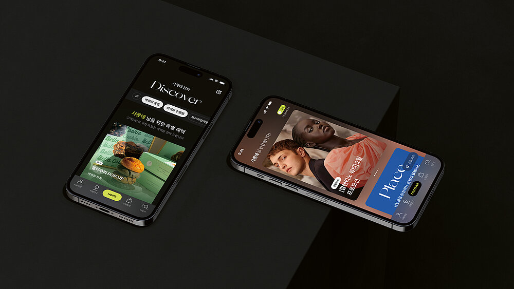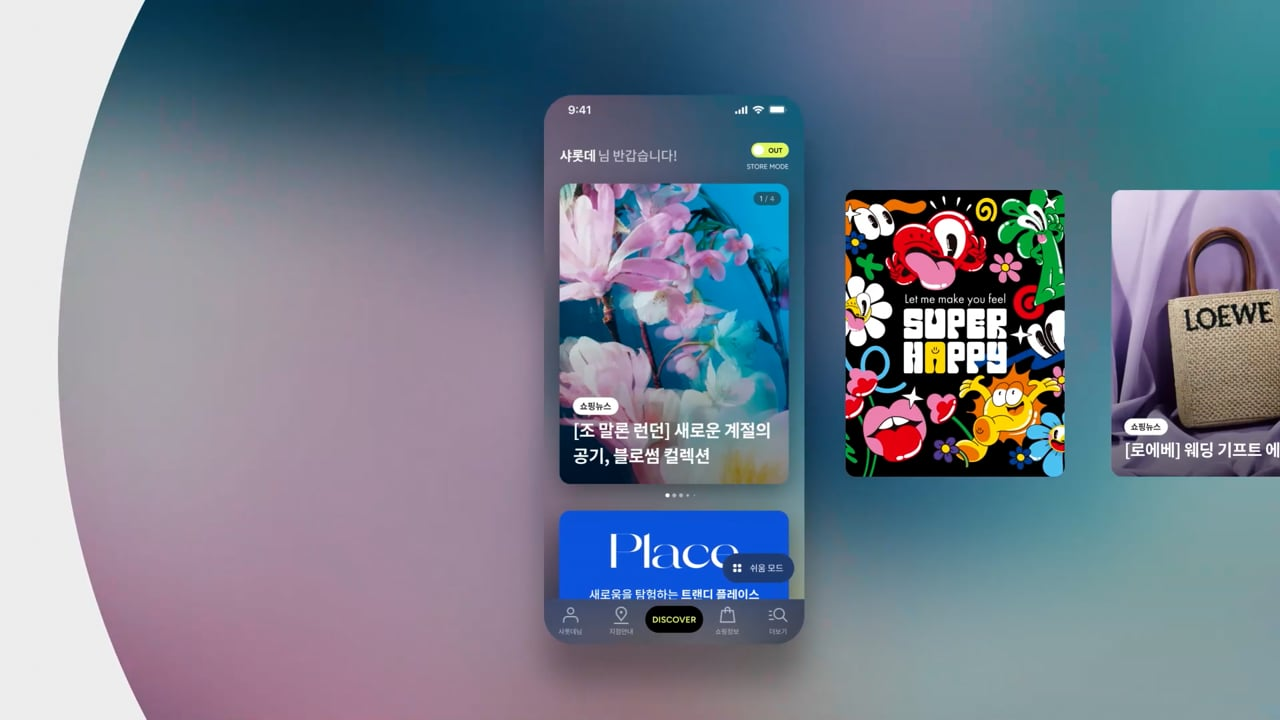 The LOTTE department store app offers a wide variety of shopping options. The Discover mode presents users with an individual feed, while "Store In" and "Store Out" modes enable the app to adapt and change on the basis of GPS data, depending on whether or not the user is currently in a shop.