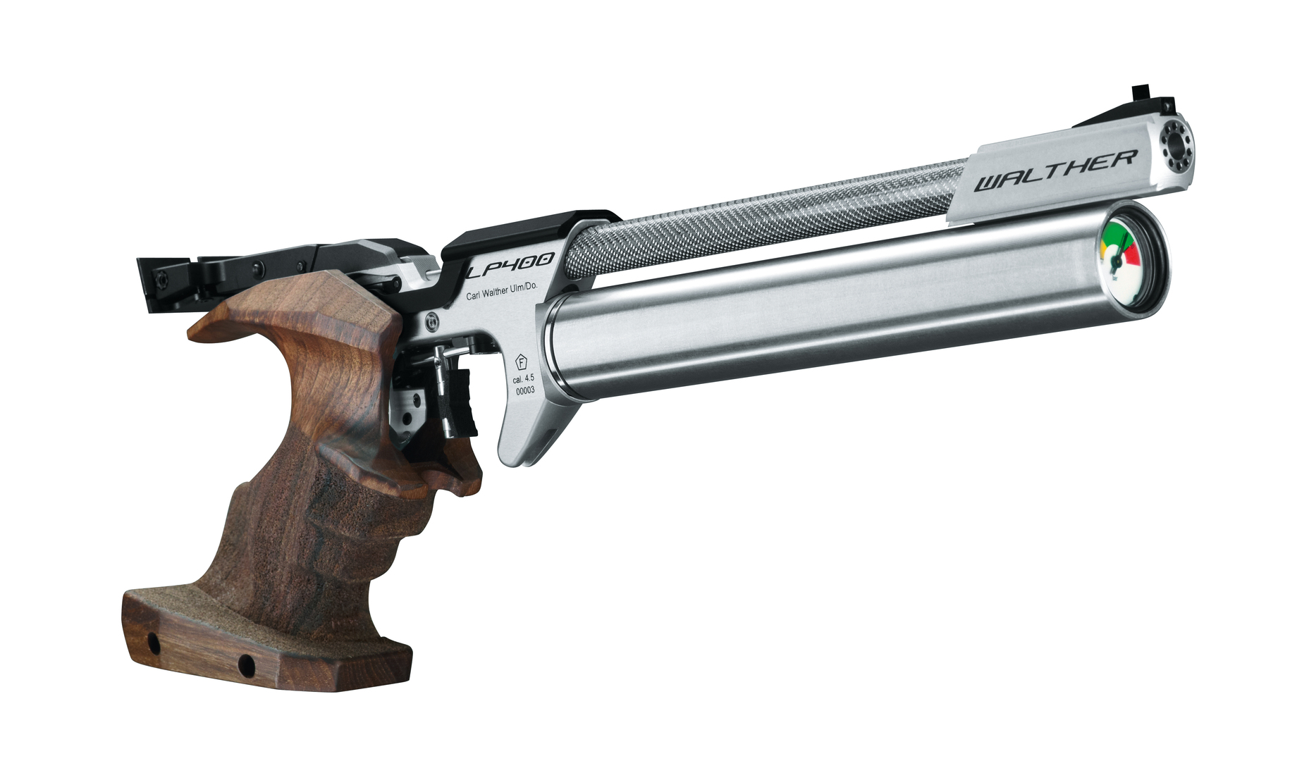 The LP400 Carbon air pistol is a high-tech sports item that implements, on the smallest scale, a range of innovations appropriate to the materials involved. With an aim to achieve an optimum grip position, all of the basic parameters – including weight, centre of gravity, shape, size, and angle of the grip, as well as trigger position – have been carefully balanced. Enhancing the pistol’s functionality and precision, the 3D-grip-angle setting with memory effect saves previously tested settings and makes them accessible at any time. The air pistol has a clear-cut design, boldly creating contrast between the carbon barrel and the ergonomically shaped wooden grip. With a basic weight of 870 grammes, the gun’s handling feels safe and steady.