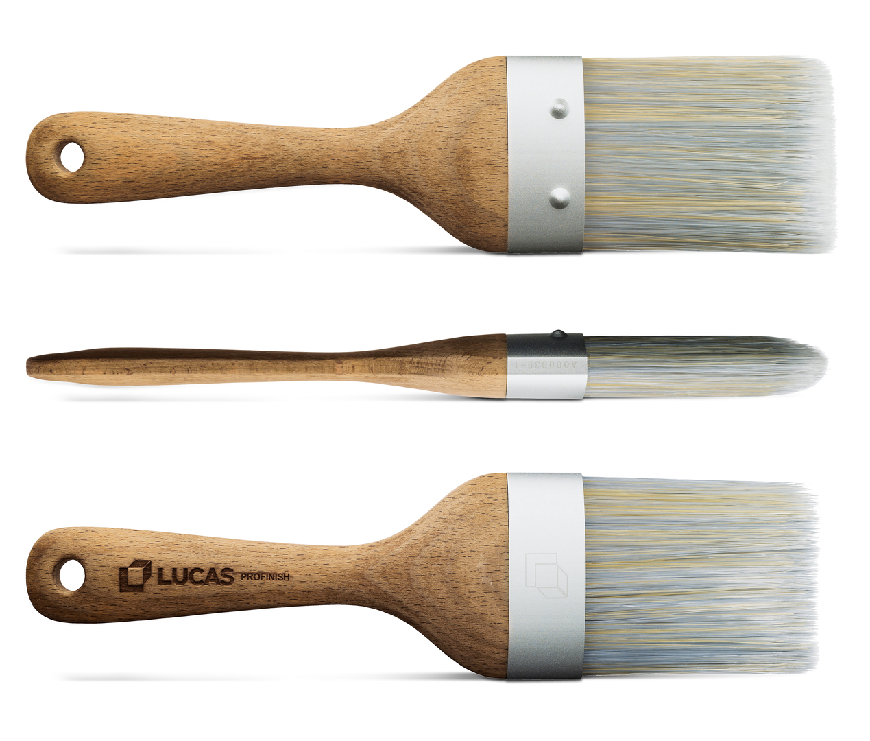 The Lucas ProFinish decorator’s paintbrush features a handle made of sustainably sourced, FSC-certified beechwood, stained with a special mix of natural tannin oils. The extruded aluminium ferrule fits flush with the handle, thus allowing the brush to rest comfortably in the hand. Furthermore, the two embossed brush rests on one side allow the paintbrush to be set down without the bristles touching the surface. Thanks to their oval shape, the bristles can absorb more paint than those of conventional brushes.