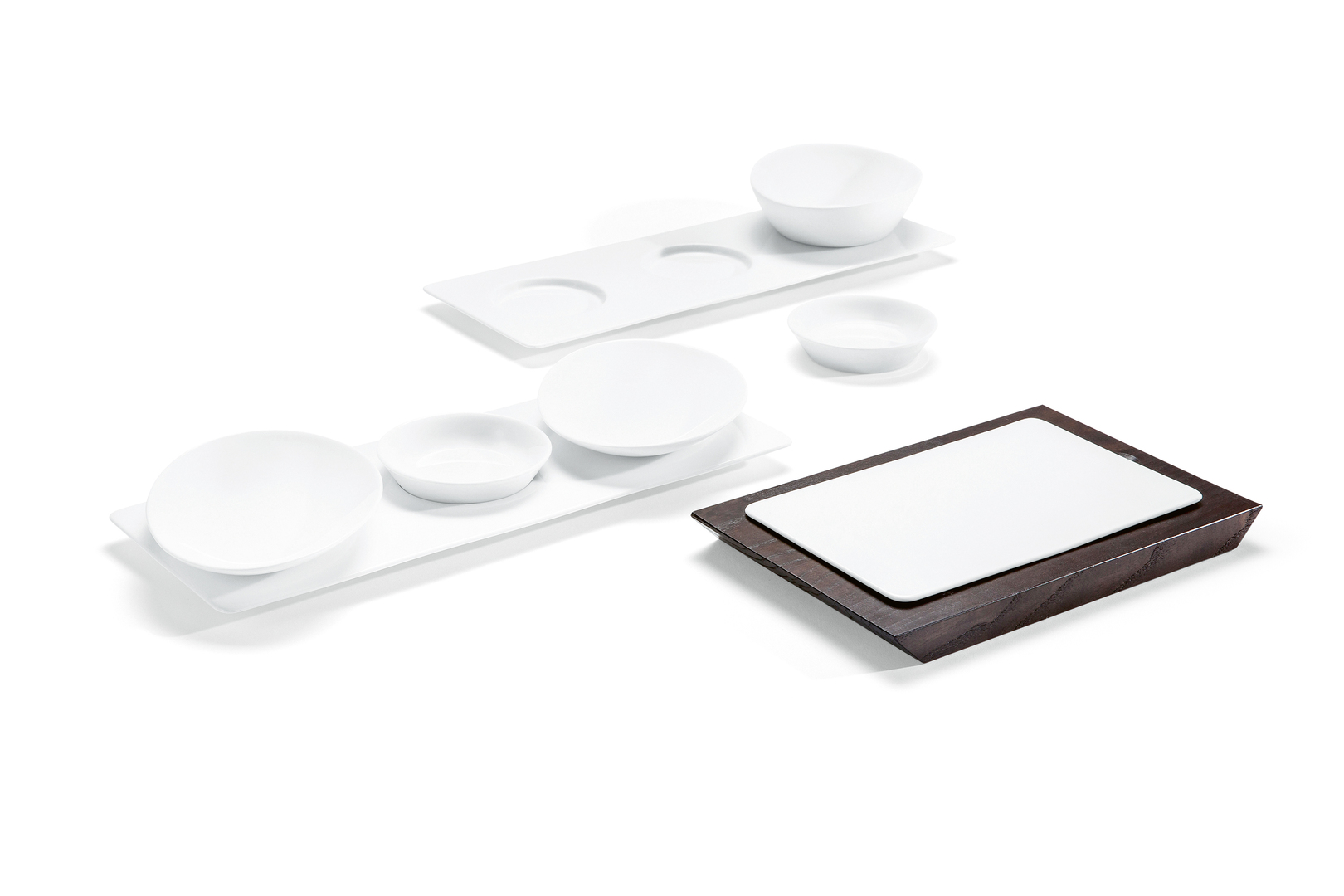 This timeless tableware features a combination of fine bone china and rustic ash wood. The serving plate with three integrated bowls and the matching Jausenplatte are part of the airline´s Dine on Demand concept. Passengers can choose and combine their individual appetizer selection. Since hygienic regulations do not allow wooden plates in airline catering, a flat porcelain plate was developed and combined with a wooden tray in order to create the authentic look of a German Jausenplatte (traditional or hearty snacks on a plate).