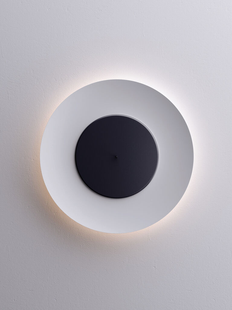 Lunaire is a wall and ceiling lamp with a lighting effect reminiscent of the phenomenon produced by a solar eclipse. A large aluminium diffuser with a concave shape is combined with a smaller front disk at its centre. The smaller disk contains the light source and produces – depending on where it is positioned in relation to the diffuser – two effects: diffused wall lighting or room lighting reflected forward.
