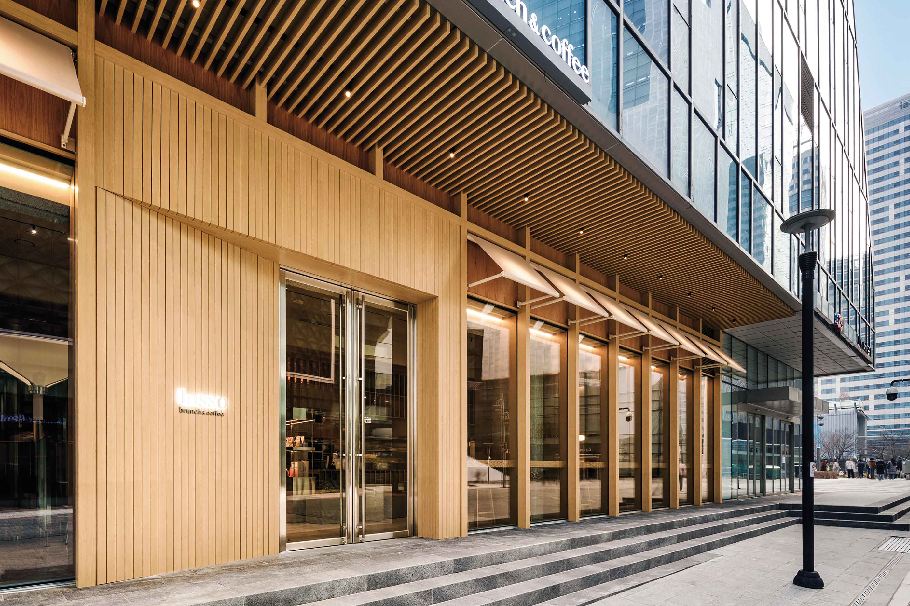 The large office building landscape of Seoul is dominated by grey buildings and concrete roads. Lusso set out to create a sanctuary — a space offering relief from this barren and colourless environment devoid of nature. At the heart of Cafe Lusso's design is a little garden nestled within the urban jungle, a gift of a space that provides a private, mentally restorative environment and eases the fatigue of office workers. High ceilings, natural wood and stone finishes, and the interplay of warm light and shadow offer a calm counterpoint to the city's fast pace. This space gently reminds visitors to 'slow down'. The spatial flow from entrance to bar table as well as the table arrangement are designed to gradually distance users from the cold concrete jungle that is outside, creating distinct experiences in each area. The natural materials in this space will develop unique hues over time, while the human touch will further mark the passage of time, adding richness and character to the space. Red Dot Award: Design Concept | Ready For Market | Interior Architecture and Interior Design
