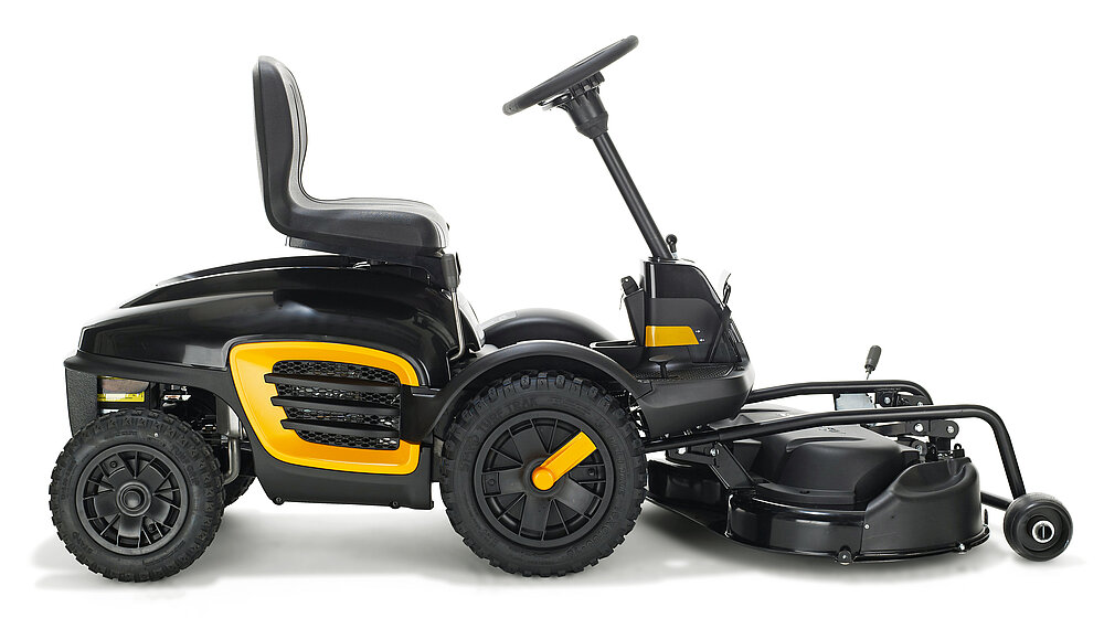 The designers of this ride-on lawn mower were inspired by classic hot-rods as is clearly noticeable from the aerodynamic tail end, the short protection guards at the front and the radiator grill on the side. The sweeping lines of the black body and the contrasting yellow accents give the impression that the lawn mower is in constant motion. The front-mounted mowing deck provides a good view of the mowing process.